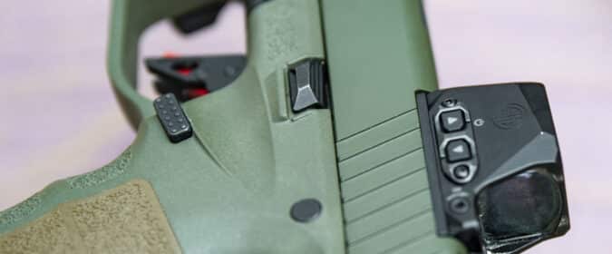 Atop you have night sights with a yellow photoluminescent front. The SAR9 SOCOM is optic-ready, but not for the larger RMR or Shield like you’d expect, but the smaller RMSc.