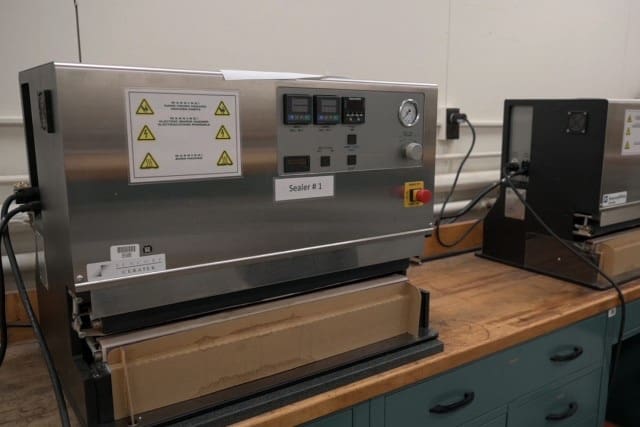 The lab is filled with various vacuum, heat and impulse sealers that suck the air out of the packaging. Analysis equipment inspects the pouches to make sure they’re strong enough. For example, tensile testers measure a material’s ability to tear, and burst testers check a package seal’s ability to withstand internal pressure before it ruptures. The lab also uses a water tank to blow ration packages up like a balloon to test for leaks — even those as small as a pinhole are marked as a failure.