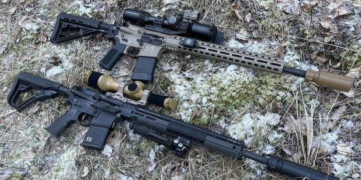 Both rifles are equipped with suppressors using ASE Utra QD mounts, keeping signature down while maintaining a consistent interface between platforms. The Coyote Brown (top) is a Mini, but it does the job more than well.