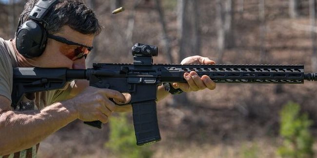 The free-floating M-LOK handguard runs the full length of the rail with a full-length Picatinny top rail, and both use an ambidextrous charging handle, a reduced-angle grip, and a 30-round polymer magazine.